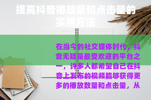 通过以上这些方法的综合运用,相信你在提高抖音播放数量和点击量方面会取得不错的效果,在抖音这个大舞台上展现自己的风采,吸引更多的粉丝和关注。