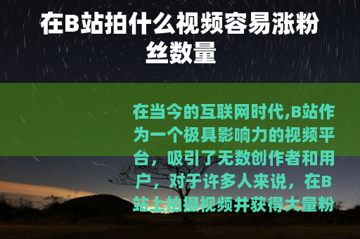 在当今的互联网时代,B站作为一个极具影响力的视频平台,吸引了无数创作者和用户,对于许多人来说,在B站上拍摄视频并获得大量粉丝是一个充满吸引力的目标,在B站拍什么视频可以涨粉丝数量呢?