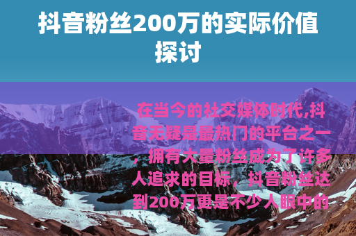 在当今的社交媒体时代,抖音无疑是最热门的平台之一,拥有大量粉丝成为了许多人追求的目标,抖音粉丝达到200万更是不少人眼中的一个重要里程碑,抖音粉丝200万有用吗?这是一个值得深入探讨的问题。