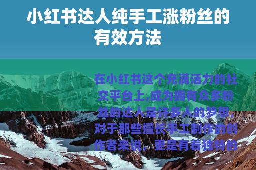 在小红书这个充满活力的社交平台上,成为拥有众多粉丝的达人是许多人的梦想,对于那些擅长手工制作的创作者来说,更是有着独特的优势可以利用来实现粉丝增长,以下是一些小红书达人纯手工涨粉丝的实用方法。