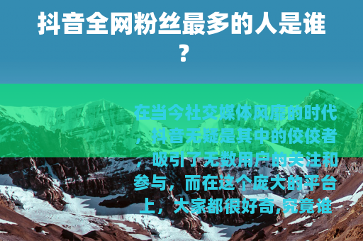 在当今社交媒体风靡的时代,抖音无疑是其中的佼佼者,吸引了无数用户的关注和参与,而在这个庞大的平台上,大家都很好奇,究竟谁是抖音全网粉丝最多的人呢?