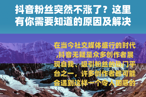 在当今社交媒体盛行的时代,抖音无疑是众多创作者展现自我、吸引粉丝的热门平台之一,许多创作者都可能会遇到这样一个令人困惑的问题:抖音粉丝突然不涨了,这一情况可能会让创作者们感到焦虑和迷茫,不知道问题出在哪里,也不知道该如何解决。