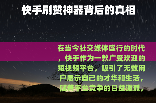 在当今社交媒体盛行的时代,快手作为一款广受欢迎的短视频平台,吸引了无数用户展示自己的才华和生活,随着平台竞争的日益激烈,一些所谓的“刷赞神器快手”开始在网络上悄然出现,引发了不少人的关注和好奇。