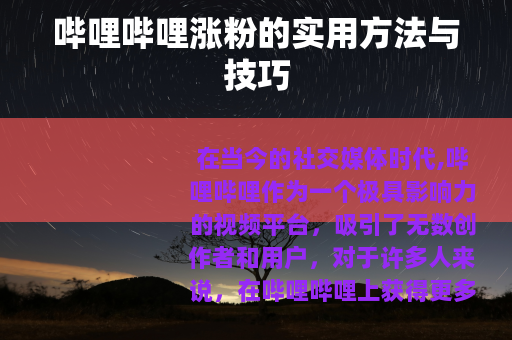 在当今的社交媒体时代,哔哩哔哩作为一个极具影响力的视频平台,吸引了无数创作者和用户,对于许多人来说,在哔哩哔哩上获得更多的粉丝是他们努力的目标之一,究竟有哪些方法可以帮助我们在哔哩哔哩上实现涨粉呢? 质量是关键,要想在哔哩哔哩上吸引粉丝,就必须提供有价值、有趣、有创意的视频内容,这意味着你需要深入了解自己的目标受众,知道他们感兴趣的话题和类型,然后根据这些来制作视频,无论是搞笑、游戏攻略、知识科普还是生活记录等各种类型,只要你能在自己擅长的领域做出高质量的内容,就有机会吸引到大量的粉丝。