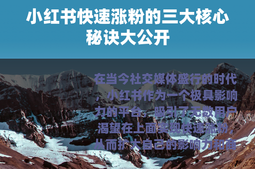 在当今社交媒体盛行的时代,小红书作为一个极具影响力的平台,吸引了无数用户渴望在上面实现快速涨粉,从而扩大自己的影响力和商业价值,小红书快速涨粉的核心秘诀究竟有哪些呢?以下为你详细揭晓三大关键要点。 是涨粉的基石,在小红书上,用户们每天都会接触到海量的信息,只有那些真正有价值、有趣、独特的内容才能脱颖而出,吸引用户的关注并促使他们点赞、收藏和分享,你可以分享自己在某个领域的专业知识和经验,像美妆领域的化妆技巧、护肤心得,或者美食领域的独特食谱、探店攻略等,通过提供实用的信息,让用户感受到从你的笔记中能获得益处,他们自然就会更愿意关注你,期待你后续能带来更多优质内容。