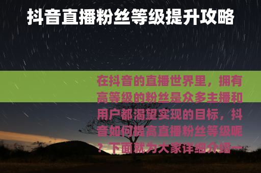 在抖音的直播世界里,拥有高等级的粉丝是众多主播和用户都渴望实现的目标,抖音如何提高直播粉丝等级呢?下面就为大家详细介绍一些有效的方法。