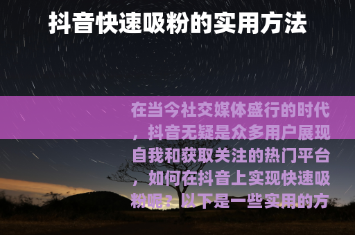 在当今社交媒体盛行的时代,抖音无疑是众多用户展现自我和获取关注的热门平台,如何在抖音上实现快速吸粉呢?以下是一些实用的方法。 是关键,要确保你的视频具有独特性和吸引力,可以从自身的兴趣爱好、特长或专业知识出发,制作出能够引发观众共鸣的内容,如果你擅长烹饪,那么可以制作一系列精美的美食制作视频,详细展示每一道菜肴的制作过程和独特技巧,让观众在观看的过程中不仅能够学到烹饪知识,还能感受到美食带来的诱惑。