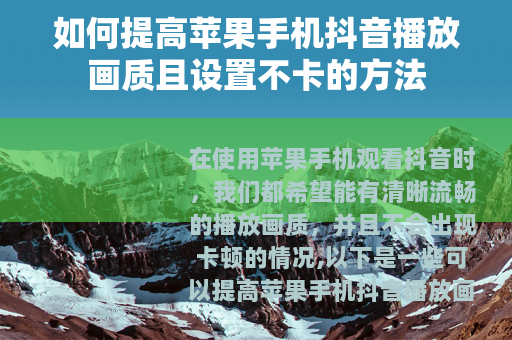 在使用苹果手机观看抖音时,我们都希望能有清晰流畅的播放画质,并且不会出现卡顿的情况,以下是一些可以提高苹果手机抖音播放画质且保证不卡的有效方法。
