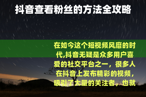 在如今这个短视频风靡的时代,抖音无疑是众多用户喜爱的社交平台之一,很多人在抖音上发布精彩的视频,吸引了大量的关注者,也就是粉丝,抖音怎样看粉丝呢?下面就为大家详细介绍几种常见的方法。