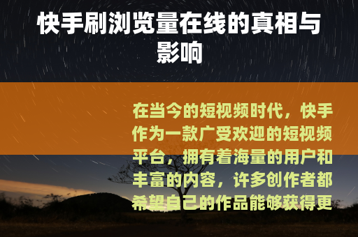 在当今的短视频时代,快手作为一款广受欢迎的短视频平台,拥有着海量的用户和丰富的内容,许多创作者都希望自己的作品能够获得更多的浏览量,从而提高知名度和影响力,在这种需求下,所谓的快手刷浏览量在线服务应运而生。