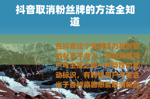 抖音取消粉丝牌的操作并不复杂,只要按照正确的流程,就能快速实现自己的需求,让你的抖音使用体验更加符合自己的意愿。