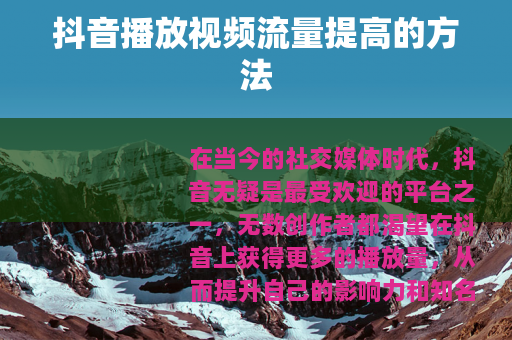 在当今的社交媒体时代,抖音无疑是最受欢迎的平台之一,无数创作者都渴望在抖音上获得更多的播放量,从而提升自己的影响力和知名度,抖音播放视频流量究竟该怎么提高呢?以下是一些实用的方法。 质量是关键,要确保你的视频具有独特性、趣味性和实用性,独特的内容能够吸引用户的注意力,让他们在众多视频中对你的作品产生兴趣,趣味性则能让用户在观看过程中感到愉悦,增加他们分享和点赞的可能性,而实用性强的视频,比如知识分享、技能教学等,往往会吸引更多有需求的用户,进而提高播放量,如果你擅长烹饪,可以制作精美的美食制作视频,详细展示每一个步骤和技巧,这样的视频很容易受到美食爱好者的喜爱和关注。