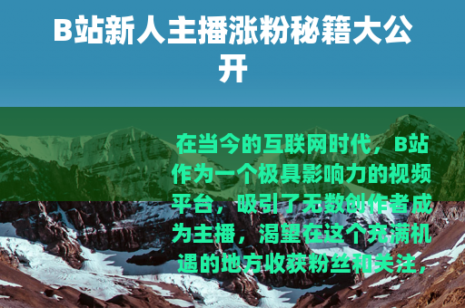 在当今的互联网时代,B站作为一个极具影响力的视频平台,吸引了无数创作者成为主播,渴望在这个充满机遇的地方收获粉丝和关注,对于B站的新人主播来说,如何涨粉是一个至关重要的问题,下面就为大家分享一些实用的涨粉方法。 是关键,新人主播要明确自己的定位和特色,找到自己擅长且有市场需求的领域,比如游戏、美食、美妆、知识科普等,只有提供有价值、有趣、独特的内容,才能吸引观众的目光并让他们产生持续关注的欲望,如果你擅长游戏,那么可以制作精彩的游戏攻略、搞笑的游戏实况等视频,让观众在观看你的视频后能够有所收获,无论是提高游戏技能还是获得欢乐。