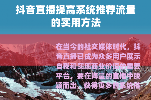 在当今的社交媒体时代,抖音直播已成为众多用户展示自我和实现商业价值的重要平台,要在海量的直播中脱颖而出,获得更多的系统推荐流量并非易事,以下是一些有效的方法,可以帮助你提高抖音直播的系统推荐流量。