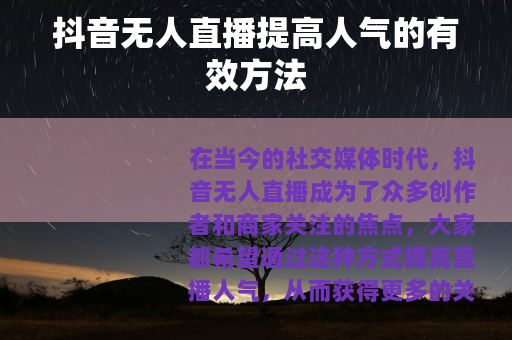 通过以上这些方法的综合运用,相信能够在抖音无人直播中提高人气,吸引更多的观众关注,从而实现自己的直播目标,在抖音这个广阔的平台上取得更好的成绩。