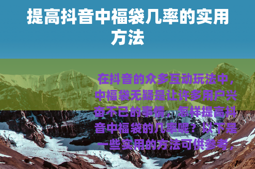 在抖音的众多互动玩法中,中福袋无疑是让许多用户兴奋不已的事情,怎样提高抖音中福袋的几率呢?以下是一些实用的方法可供参考。