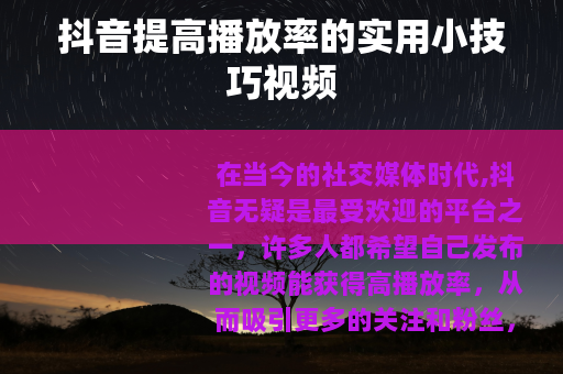 通过运用这些小技巧,你可以大大提高抖音视频的播放率,让你的作品在抖音的海洋中脱颖而出,吸引更多的用户关注和喜爱,不断尝试和实践,找到最适合自己的方法,相信你在抖音上一定能取得更好的成绩。