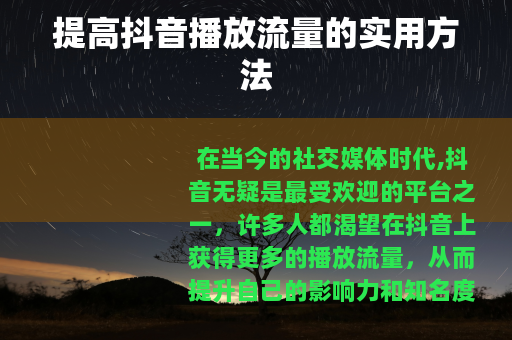 要提高抖音播放流量需要从多个方面入手,不断优化自己的视频内容和运营策略,只要坚持不懈地努力,相信你在抖音上一定能获得更多的关注和流量,实现自己的目标。
