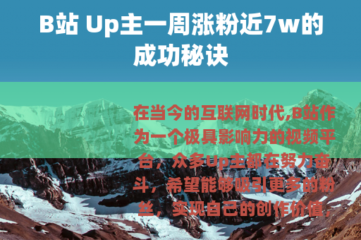 在当今的互联网时代,B站作为一个极具影响力的视频平台,众多Up主都在努力奋斗,希望能够吸引更多的粉丝,实现自己的创作价值,有一些Up主取得了令人瞩目的成绩,比如有这样一位Up主在短短一周内涨粉近7w,这无疑是一个非常了不起的成就。