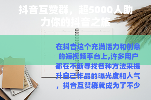 在抖音这个充满活力和创意的短视频平台上,许多用户都在不断寻找各种方法来提升自己作品的曝光度和人气,抖音互赞群就成为了不少人的选择。