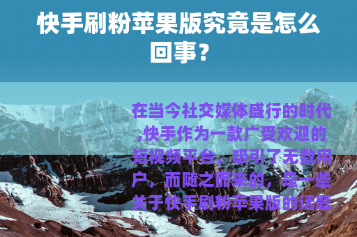 在当今社交媒体盛行的时代,快手作为一款广受欢迎的短视频平台,吸引了无数用户,而随之而来的,是一些关于快手刷粉苹果版的话题引起了大家的关注。