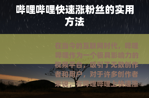 在当今的互联网时代,哔哩哔哩作为一个极具影响力的视频平台,吸引了无数创作者和用户,对于许多创作者来说,在哔哩哔哩上快速涨粉丝是他们共同的目标,如何才能在哔哩哔哩上实现快速涨粉丝呢?以下是一些实用的方法。