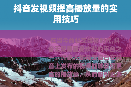 在当今的社交媒体时代,抖音无疑是最受欢迎的平台之一,许多人都希望自己在抖音上发布的视频能够获得更高的播放量,从而吸引更多的关注和粉丝,抖音怎么发视频才能提高播放量呢?以下是一些实用的技巧。 要具有吸引力,这意味着你需要找到一个独特的主题或角度,能够在众多的视频中脱颖而出,你可以分享一些有趣的生活故事、实用的生活小妙招、精彩的才艺表演或者是热门话题的独特见解等,确保你的视频内容能够引起观众的兴趣,让他们愿意花时间观看。