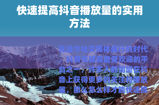 在当今社交媒体盛行的时代,抖音无疑是最受欢迎的平台之一,许多人都渴望在抖音上获得更多的关注和播放量,那么怎么样才能快速提高抖音的播放量呢?以下是一些实用的方法。 创作是关键,要确保你的视频内容具有吸引力和独特性,了解你的目标受众,创作出他们感兴趣的话题和风格的视频,可以是有趣的搞笑段子、实用的生活小技巧、精彩的才艺表演或者是引人深思的观点分享等,只有当你的内容能够引起观众的共鸣和兴趣,他们才会更愿意观看你的视频并分享给他人,从而提高播放量。