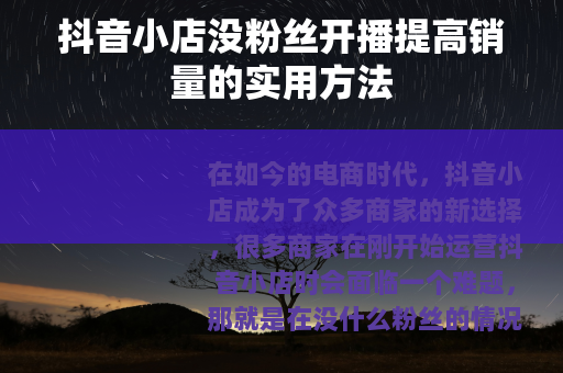 在如今的电商时代,抖音小店成为了众多商家的新选择,很多商家在刚开始运营抖音小店时会面临一个难题,那就是在没什么粉丝的情况下开播,如何提高销量呢?以下是一些有效的方法可以帮助你解决这个问题。
