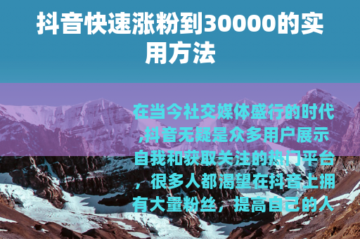 通过以上这些方法的持续实践和不断优化,你就有很大的机会在抖音上快速涨粉到30000,提高自己的人气,在抖音这个大舞台上展现自己的风采,收获更多的关注和喜爱。