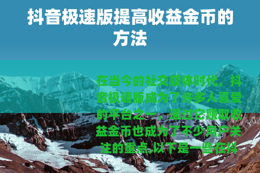 在当今的社交媒体时代,抖音极速版成为了许多人喜爱的平台之一,通过它赚取收益金币也成为了不少用户关注的重点,以下是一些在抖音极速版中提高收益金币的有效方法。