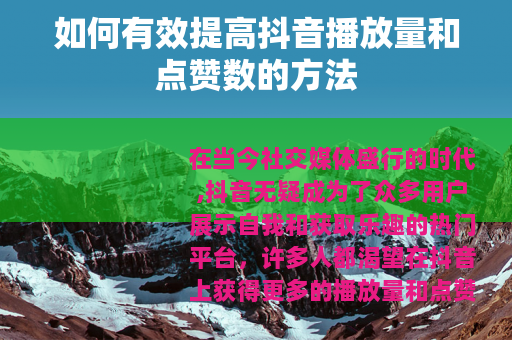 在当今社交媒体盛行的时代,抖音无疑成为了众多用户展示自我和获取乐趣的热门平台,许多人都渴望在抖音上获得更多的播放量和点赞数,以提升自己的影响力和成就感,究竟如何提高抖音播放和点赞呢?以下是一些实用的方法。 质量是关键,要确保你的视频具有独特性和吸引力,可以从自身的兴趣、特长出发,挖掘一些新颖的主题,这样更容易引起用户的关注,如果你擅长烹饪,那么可以制作一系列精美的美食制作视频,通过独特的配方和详细的制作过程展示,吸引美食爱好者的目光,在视频制作过程中,要注重画面的稳定性和清晰度,避免模糊或晃动的画面影响用户体验。