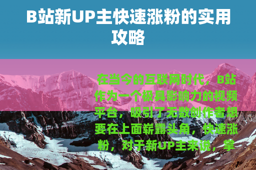 在当今的互联网时代,B站作为一个极具影响力的视频平台,吸引了无数创作者想要在上面崭露头角,快速涨粉,对于新UP主来说,掌握一些有效的攻略是非常关键的。 是王道,新UP主需要明确自己的定位和擅长的领域,然后创作具有特色和价值的视频内容,如果你擅长游戏,那么可以制作精彩的游戏攻略、搞笑的游戏实况等,要确保视频的画质清晰、声音清楚,给观众带来良好的视听体验。