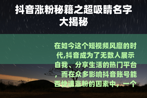 在如今这个短视频风靡的时代,抖音成为了无数人展示自我、分享生活的热门平台,而在众多影响抖音账号能否快速涨粉的因素中,一个特别容易涨粉的抖音名字起着至关重要的作用,什么样的抖音名字能够让你在众多用户中脱颖而出,吸引大量粉丝关注呢?我们就来一起探讨一下这个话题。