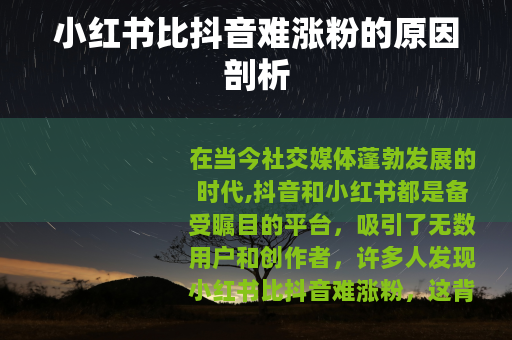 小红书比抖音难涨粉是由多种因素共同作用的结果,创作者在选择平台时,需要充分了解各平台的特点和规则,结合自身的优势和目标,制定合适的创作策略,才能在社交媒体的海洋中实现涨粉的目标,取得更好的发展。