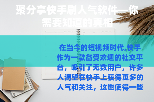 在当今的短视频时代,快手作为一款备受欢迎的社交平台,吸引了无数用户,许多人渴望在快手上获得更多的人气和关注,这也使得一些所谓的快手刷人气软件应运而生,其中聚分享快手刷人气软件就是比较受关注的一款。