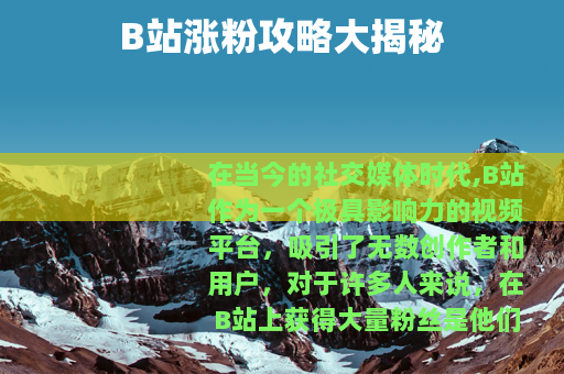 在当今的社交媒体时代,B站作为一个极具影响力的视频平台,吸引了无数创作者和用户,对于许多人来说,在B站上获得大量粉丝是他们的梦想,那么究竟有哪些秘诀可以帮助我们在B站实现涨粉呢? 质量是关键,要制作出优质、有吸引力的视频内容,这意味着你需要有独特的创意和视角,能够提供给观众有价值的信息或娱乐体验,无论是知识科普、搞笑娱乐、美食分享还是游戏攻略等各种类型的视频,都要确保其内容充实、制作精良,在视频的拍摄上,要注意光线、画面稳定性和声音清晰度等,以给观众带来良好的观看感受。