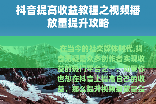 在当今的社交媒体时代,抖音无疑是众多创作者实现收益的热门平台之一,如果你也想在抖音上提高自己的收益,那么提升视频播放量是至关重要的一环,以下是一些关于抖音如何提高收益教程中视频播放量的有效方法。 质量是关键,确保你的视频内容具有独特性、趣味性和实用性,独特的创意能够吸引用户的注意力,让他们在众多视频中选择观看你的作品,趣味性则能让观众在观看过程中感到愉悦,从而更愿意停留并分享你的视频,而实用性强的内容,如生活小妙招、专业知识讲解等,会让用户觉得观看你的视频能获得价值,进而增加对你的关注和忠诚度。