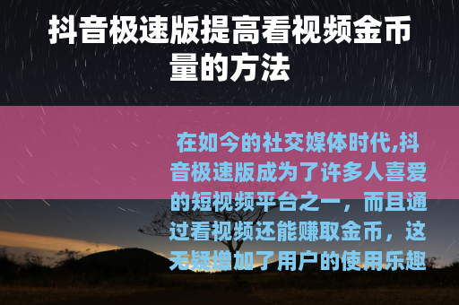 在如今的社交媒体时代,抖音极速版成为了许多人喜爱的短视频平台之一,而且通过看视频还能赚取金币,这无疑增加了用户的使用乐趣和收益,如何在抖音极速版中提高看视频的金币量呢?以下是一些实用的方法。