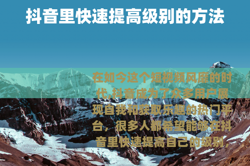 在如今这个短视频风靡的时代,抖音成为了众多用户展现自我和获取乐趣的热门平台,很多人都希望能够在抖音里快速提高自己的级别,从而获得更多的关注和机会,以下是一些在抖音里快速提高级别的有效方法。