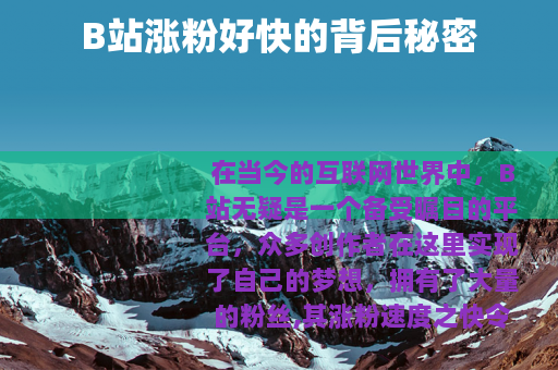 在当今的互联网世界中,B站无疑是一个备受瞩目的平台,众多创作者在这里实现了自己的梦想,拥有了大量的粉丝,其涨粉速度之快令人惊叹。