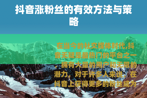 在当今的社交媒体时代,抖音无疑是最热门的平台之一,拥有大量的用户和无限的潜力,对于许多人来说,在抖音上获得更多的粉丝成为了一个重要的目标,因为这不仅能带来更多的关注和认可,还可能为个人或品牌创造更多的机会。