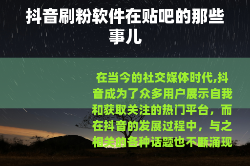抖音刷粉软件在贴吧的讨论虽然热闹,但我们要清楚认识到其背后的真相和风险,选择正确的方式来经营自己的抖音账号,才能在抖音的世界里走得更稳更远。