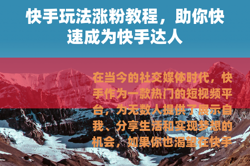 在当今的社交媒体时代,快手作为一款热门的短视频平台,为无数人提供了展示自我、分享生活和实现梦想的机会,如果你也渴望在快手上获得大量粉丝,提升自己的影响力,那么这篇快手玩法涨粉教程将为你提供一些实用的方法和技巧。