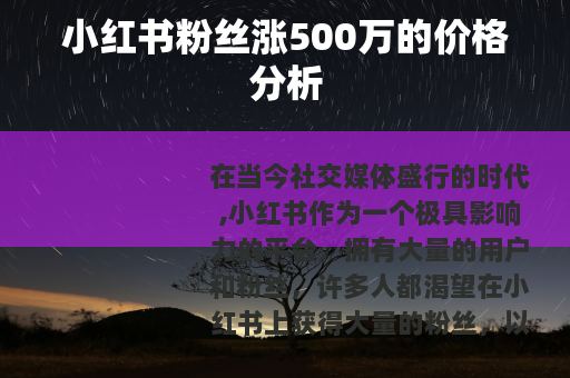 在当今社交媒体盛行的时代,小红书作为一个极具影响力的平台,拥有大量的用户和粉丝,许多人都渴望在小红书上获得大量的粉丝,以提升自己的影响力和商业价值,一个备受关注的问题就是,在小红书上粉丝涨500万需要多少钱呢?