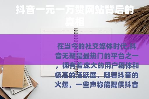 在当今的社交媒体时代,抖音无疑是最热门的平台之一,拥有着庞大的用户群体和极高的活跃度,随着抖音的火爆,一些声称能提供抖音一元一万赞服务的网站也悄然出现,吸引了不少人的关注。