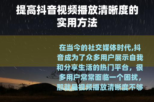 在当今的社交媒体时代,抖音成为了众多用户展示自我和分享生活的热门平台,很多用户常常面临一个困扰,那就是视频播放清晰度不够理想,如何提高抖音视频播放清晰度呢?以下是一些有效的方法。