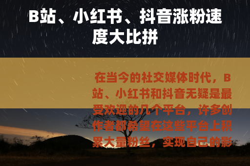 在当今的社交媒体时代,B站、小红书和抖音无疑是最受欢迎的几个平台,许多创作者都希望在这些平台上积累大量粉丝,实现自己的影响力和价值,B站、小红书和抖音哪个涨粉快呢?这是一个众多创作者都关心的问题。