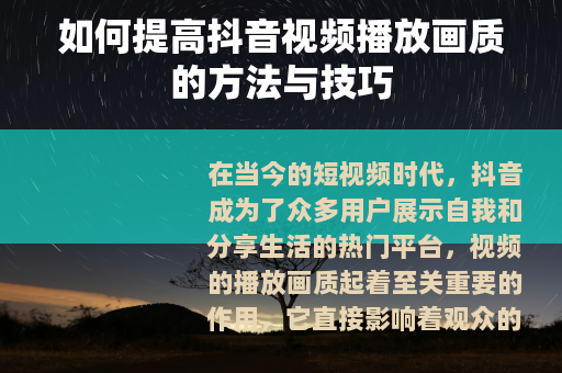 在当今的短视频时代,抖音成为了众多用户展示自我和分享生活的热门平台,视频的播放画质起着至关重要的作用,它直接影响着观众的观看体验和对内容的喜爱程度,如何提高抖音视频播放画质呢?以下是一些实用的方法和技巧。