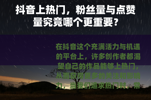 在抖音这个充满活力与机遇的平台上,许多创作者都渴望自己的作品能够上热门,从而获得更多的关注和影响力,当我们追求热门时,常常会面临一个问题:到底是提高粉丝量好,还是增加点赞量更有利呢?